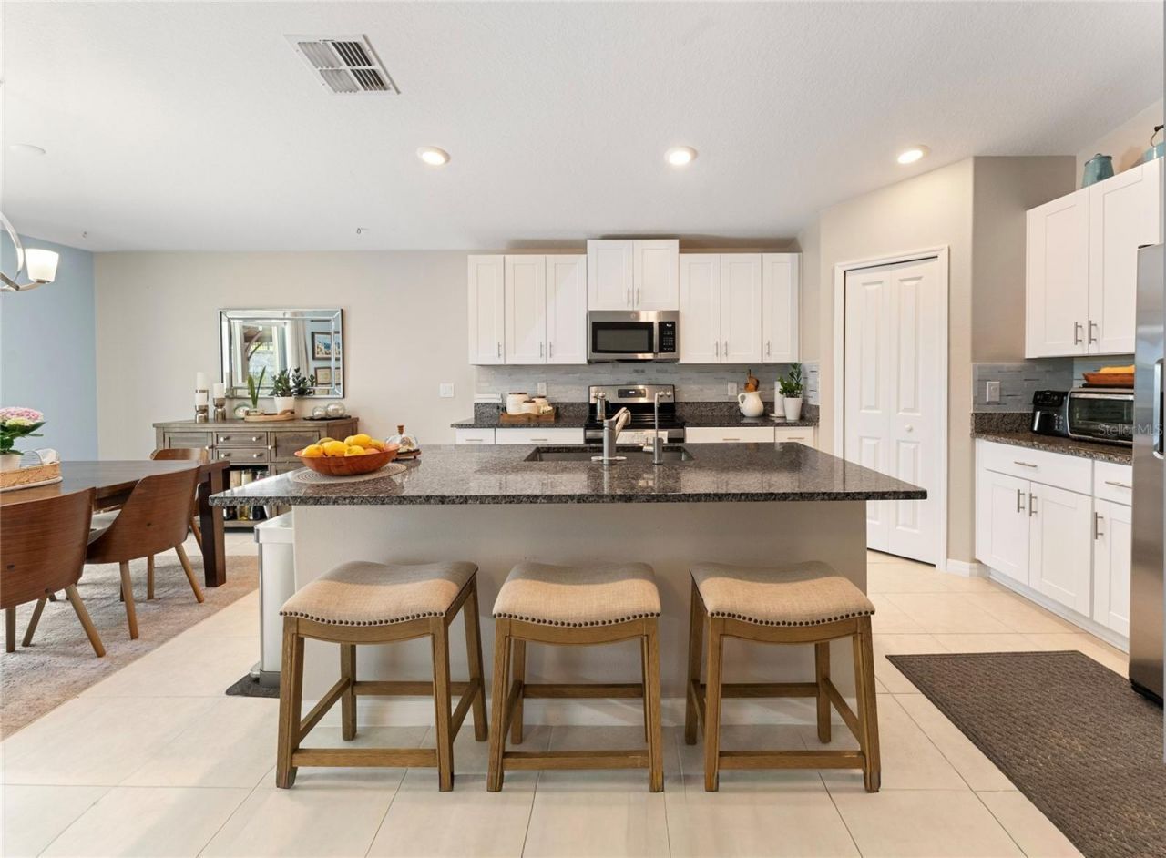 Step into this stunning, like-new 3-bedroom, 2.5-bath home in the sought-after community of Abbot Square! From the moment you walk in, you'll appreciate the bright, open layout where the family room, dining area, and kitchen come together seamlessly-perfect for entertaining or everyday living. The kitchen is a standout feature, showcasing shaker-style cabinetry, granite countertops, stainless steel appliances, and a large center island that makes cooking and gathering effortless. Porcelain tile flooring flows through the main living areas, while the bedrooms offer cozy carpet for added comfort. The split floor plan provides privacy, with a spacious primary suite that feels like a true retreat. Enjoy a spa-inspired bathroom with a double vanity, ample storage, and a large walk-in closet enhanced with a custom Closet by Design system.Step outside to your own private escape, where the oversized lanai is perfect for relaxing or entertaining, overlooking a fully fenced backyard with plenty of space for activities, complemented by outdoor pavers, a stylish pergola, and lush landscaping that creates a peaceful setting.Complete with a 2-car garage offering flexibility for storage or additional needs, this home combines modern finishes, thoughtful design, and inviting outdoor living-all in one impressive package.Located in the master-planned community of Abbott Square, residents enjoy resort-style amenities including a pool, clubhouse, fitness center, playground, walking trails, and outdoor spaces with grilling areas. The low HOA fee includes high-speed internet for added convenience. Ideally situated in Zephyrhills, just minutes from Wesley Chapel, you'll have easy access to shopping, dining, medical facilities, and major highways-offering the perfect blend of comfort and accessibility. Schedule your showing today!